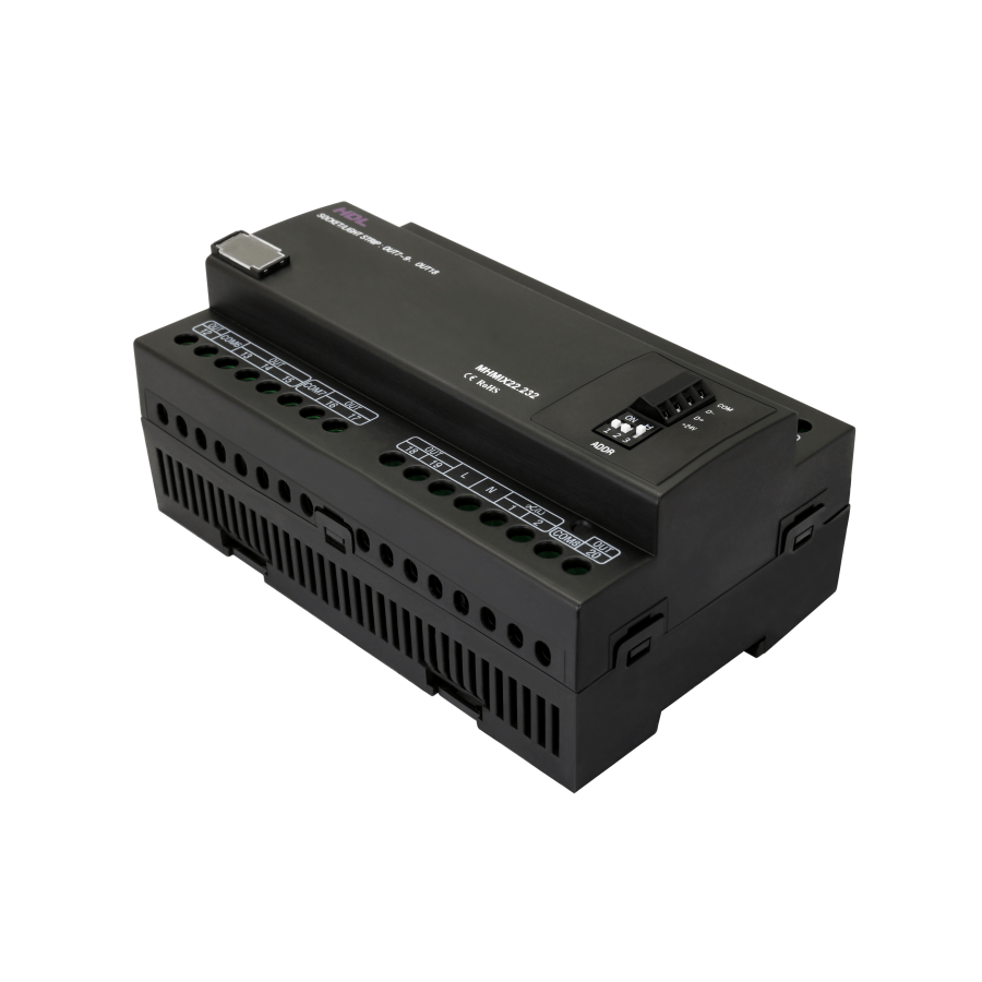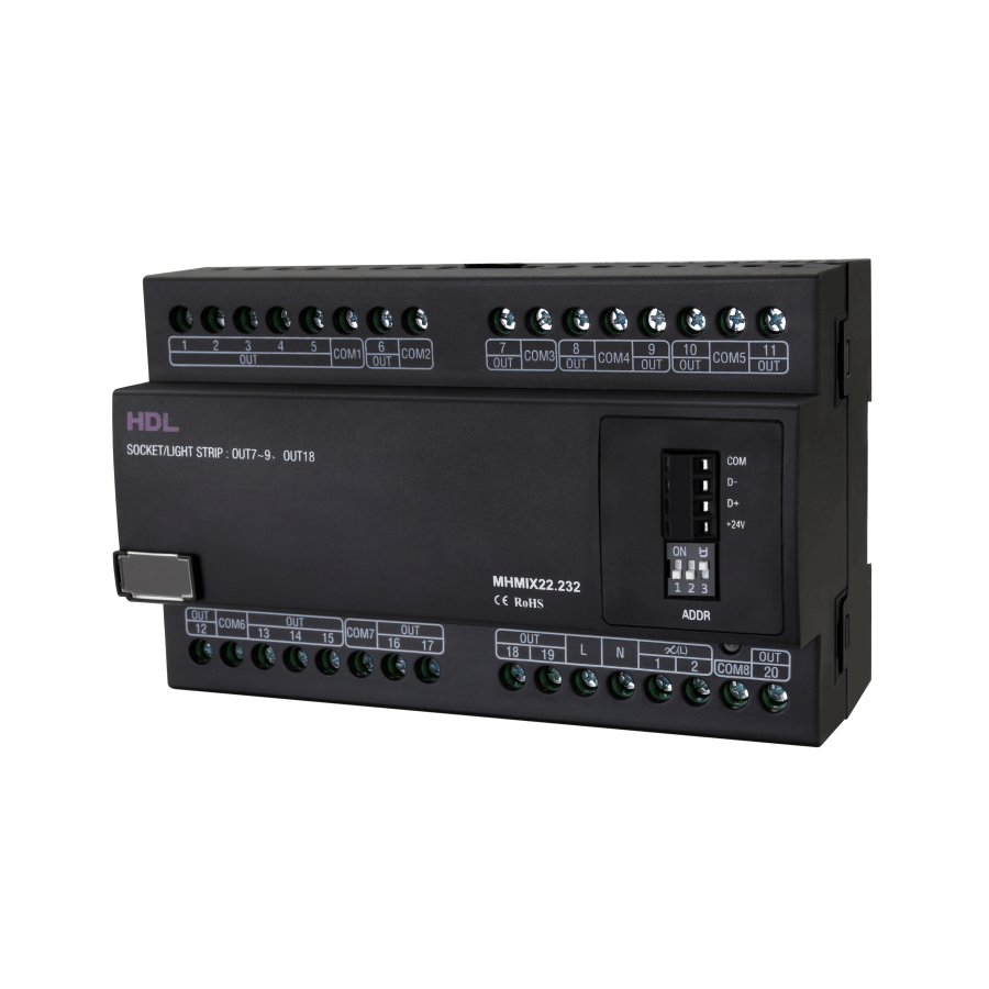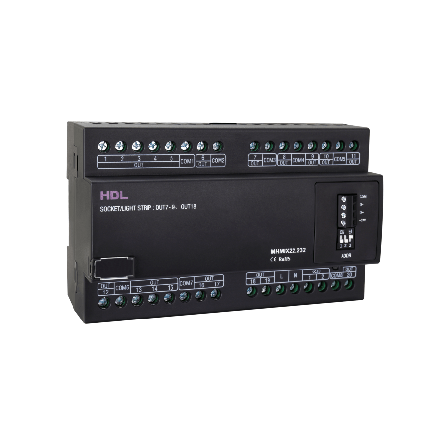 Módulo Buspro de control mixto de habitación de hotel de 16 Canales de relés de 5A, 4 canales de relés de 10A y 2 canales de dimmers leading edge de 0.5A. Modelo: HDL-MHMIX22.232.